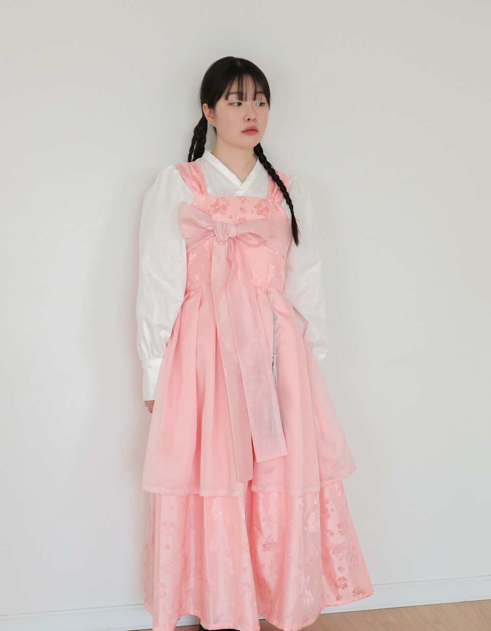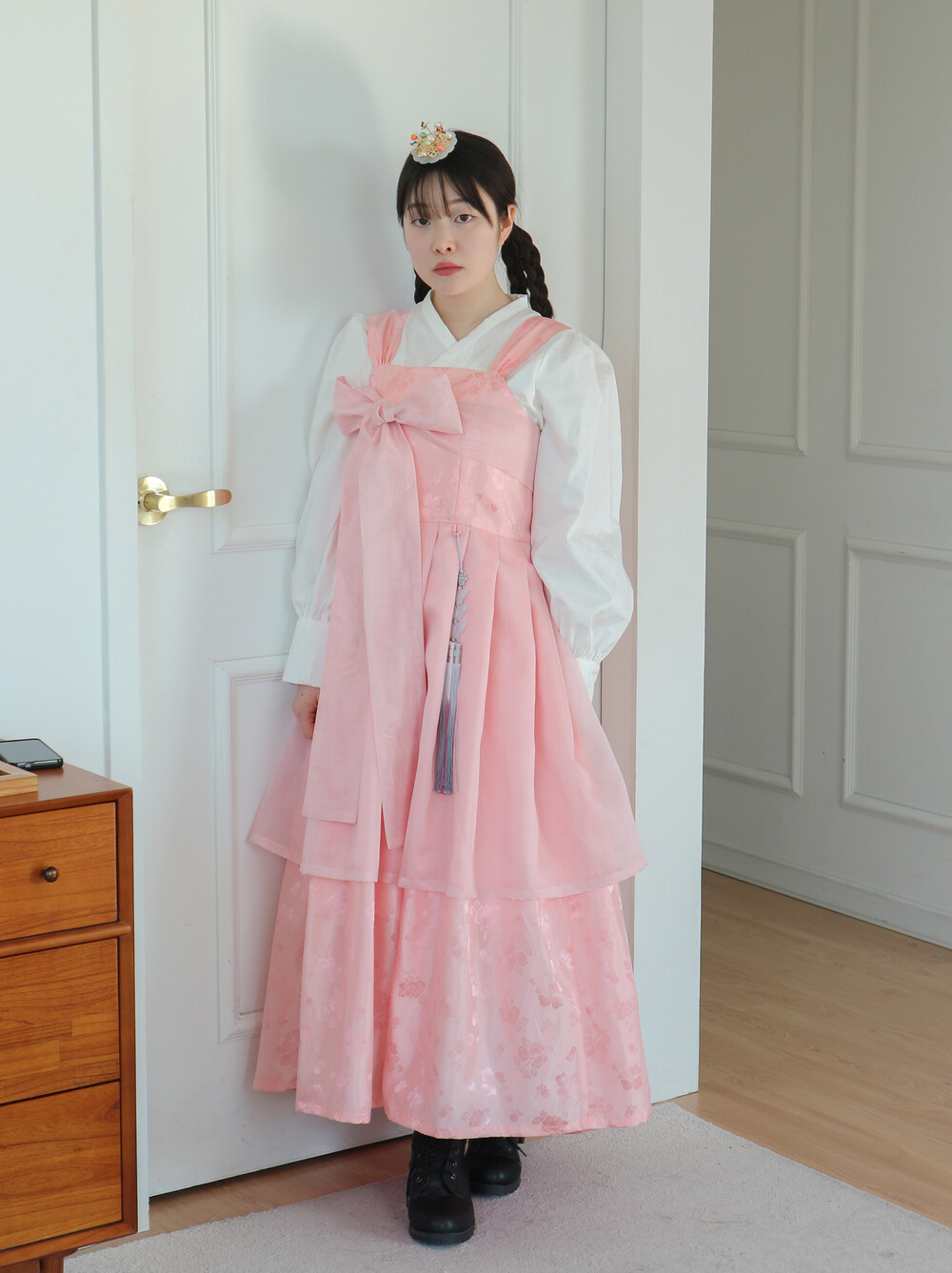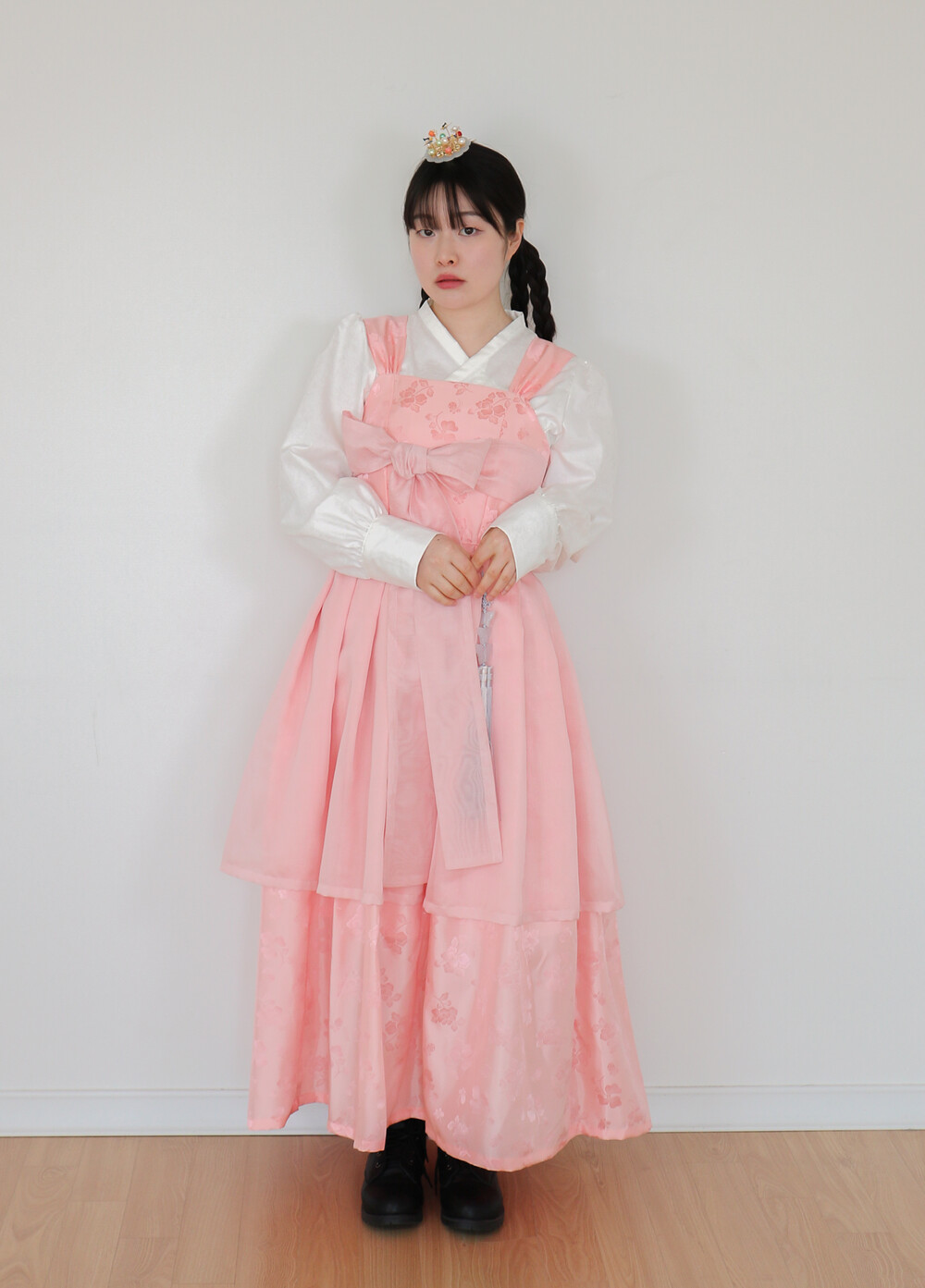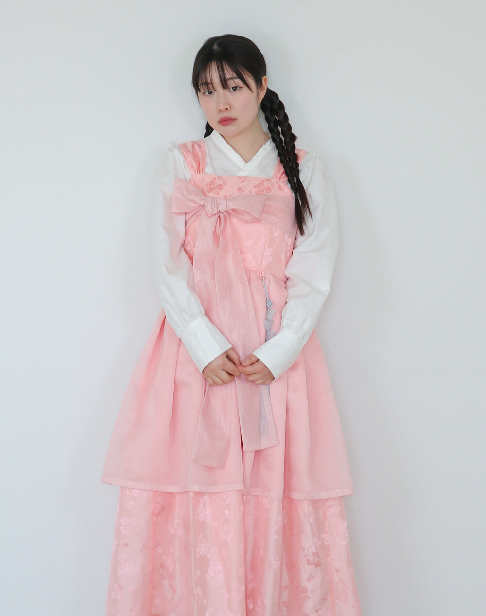 화이트 저고리나 블라우스와 함께 착용하기 좋으며, 단독으로도 멋스럽게 연출할 수 있습니다. 허리부분의 고리를 활용해 전통적인 노리개부터 다양한 장신구까지 스타일링할 수 있으며, 사랑스럽고 화려한 디자인으로 공연 한복으로도 활용하기 좋은 원피스입니다.