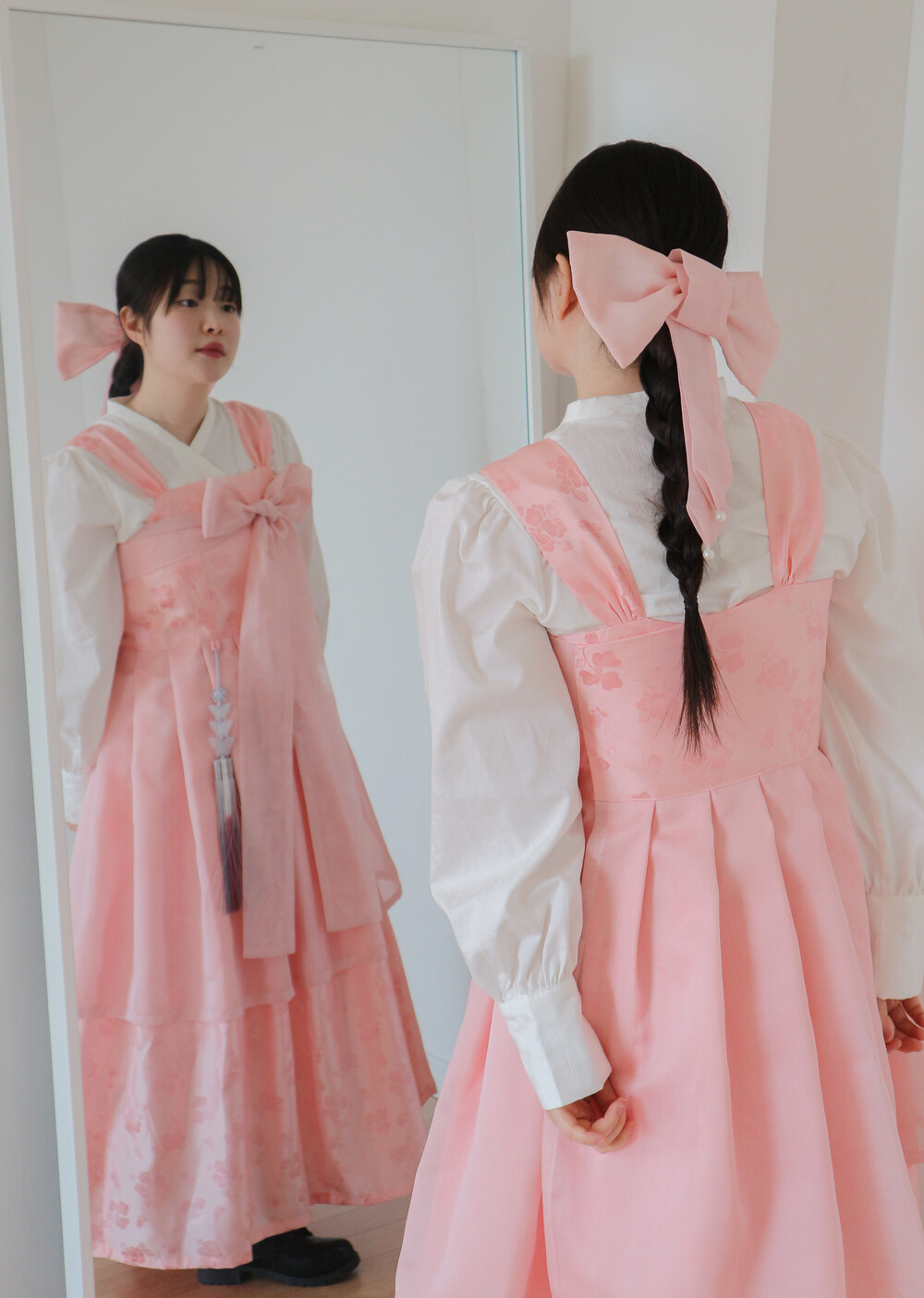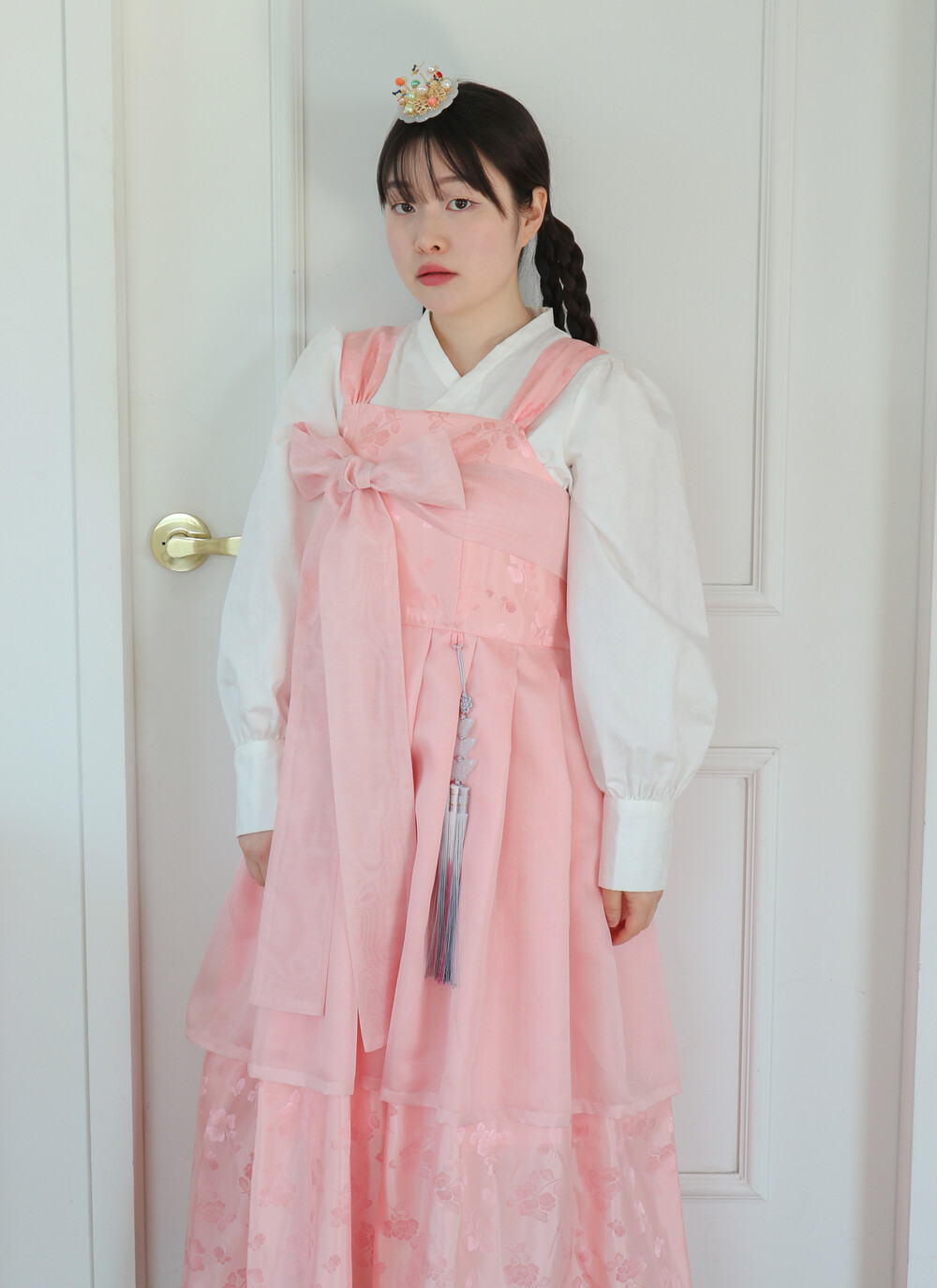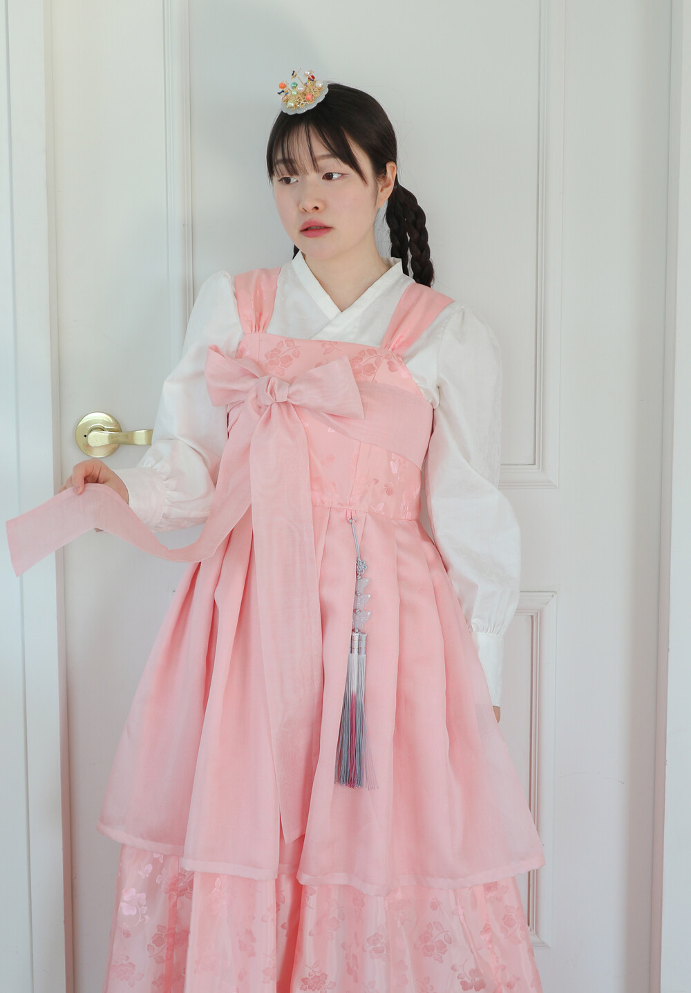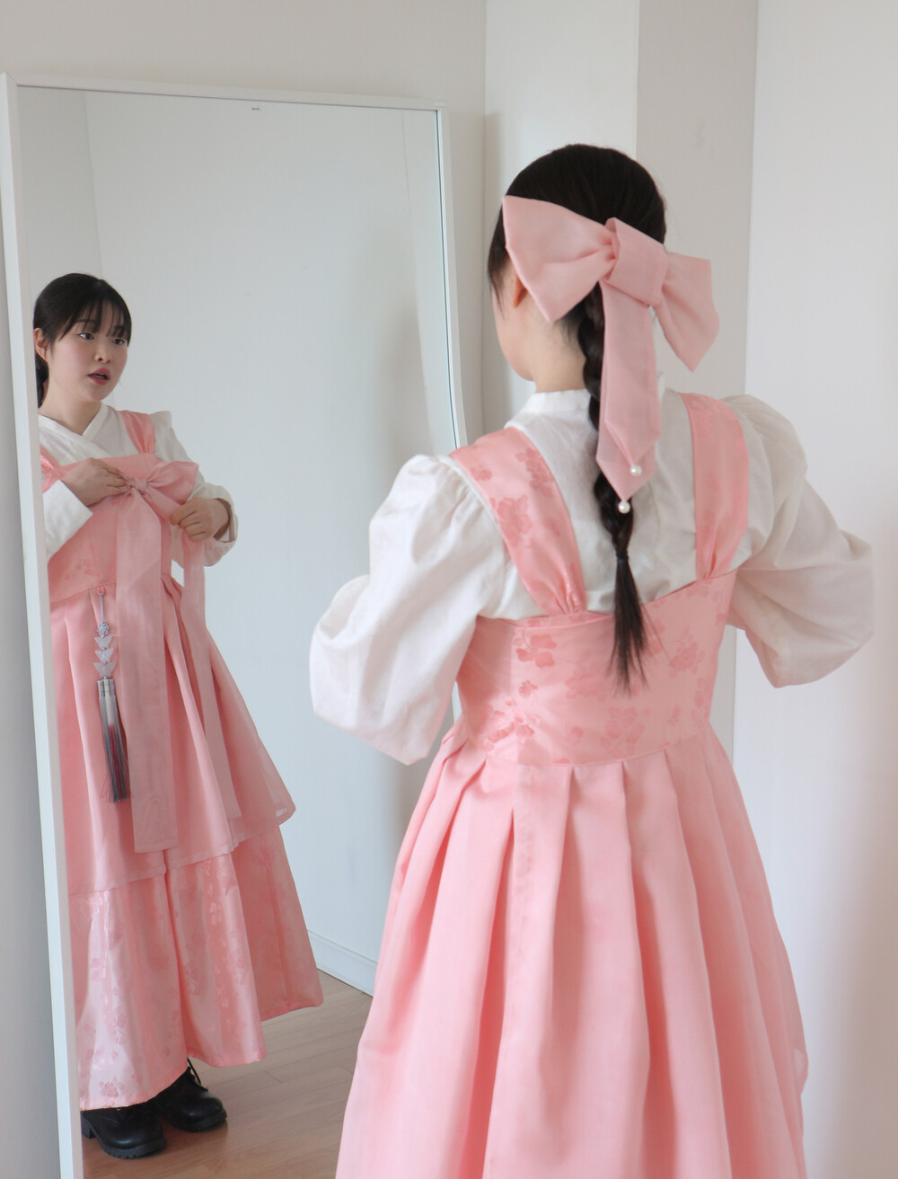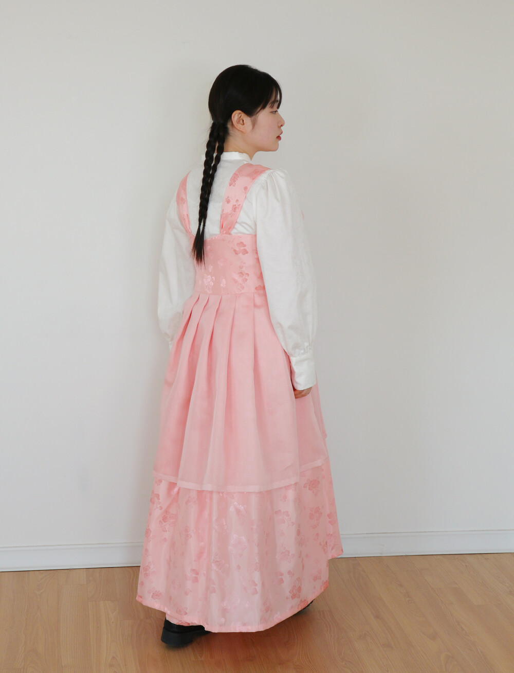 화이트 저고리나 블라우스와 함께 착용하기 좋으며, 단독으로도 멋스럽게 연출할 수 있습니다. 허리부분의 고리를 활용해 전통적인 노리개부터 다양한 장신구까지 스타일링할 수 있으며, 사랑스럽고 화려한 디자인으로 공연 한복으로도 활용하기 좋은 원피스입니다.