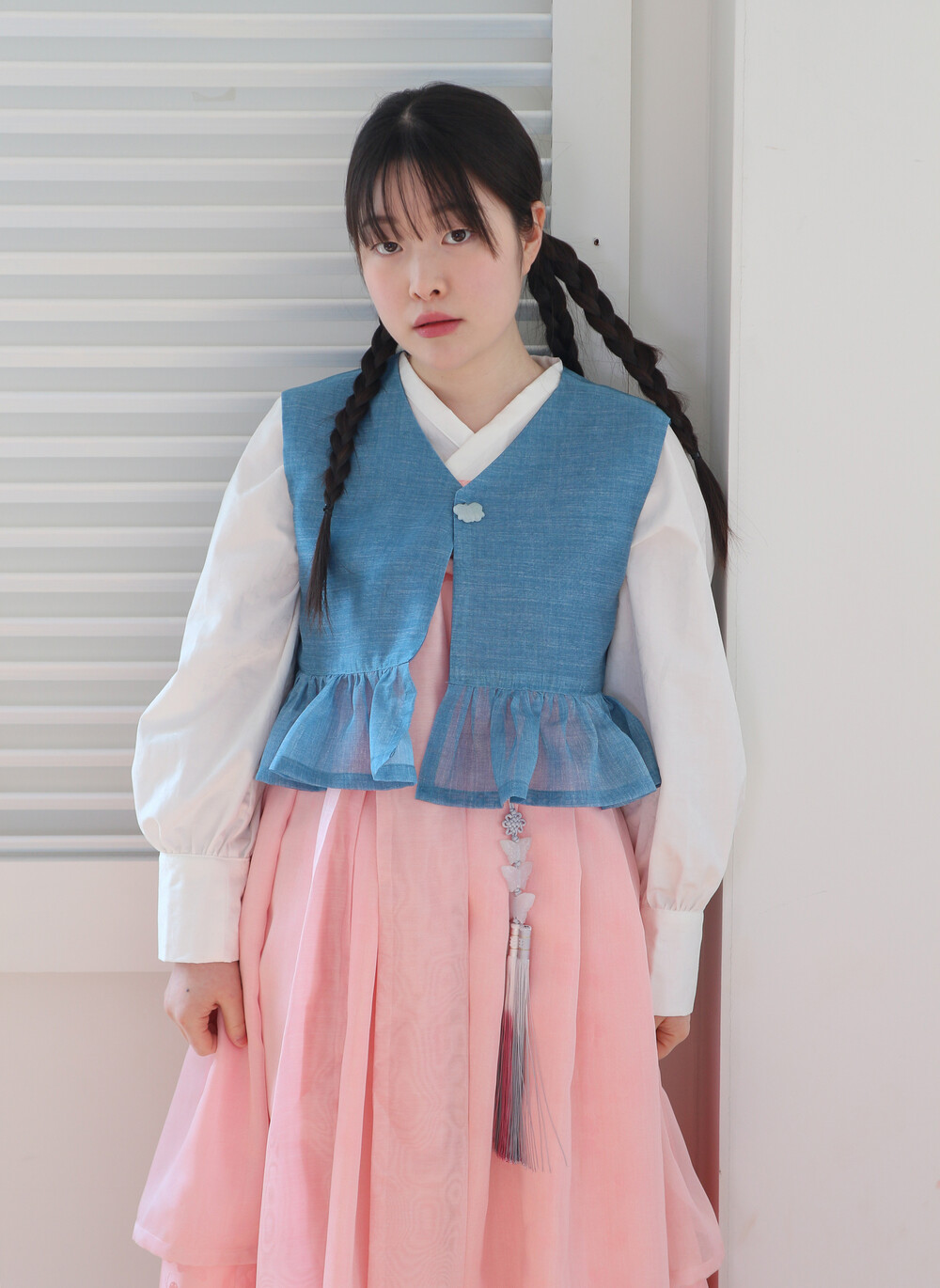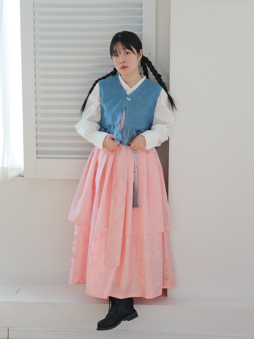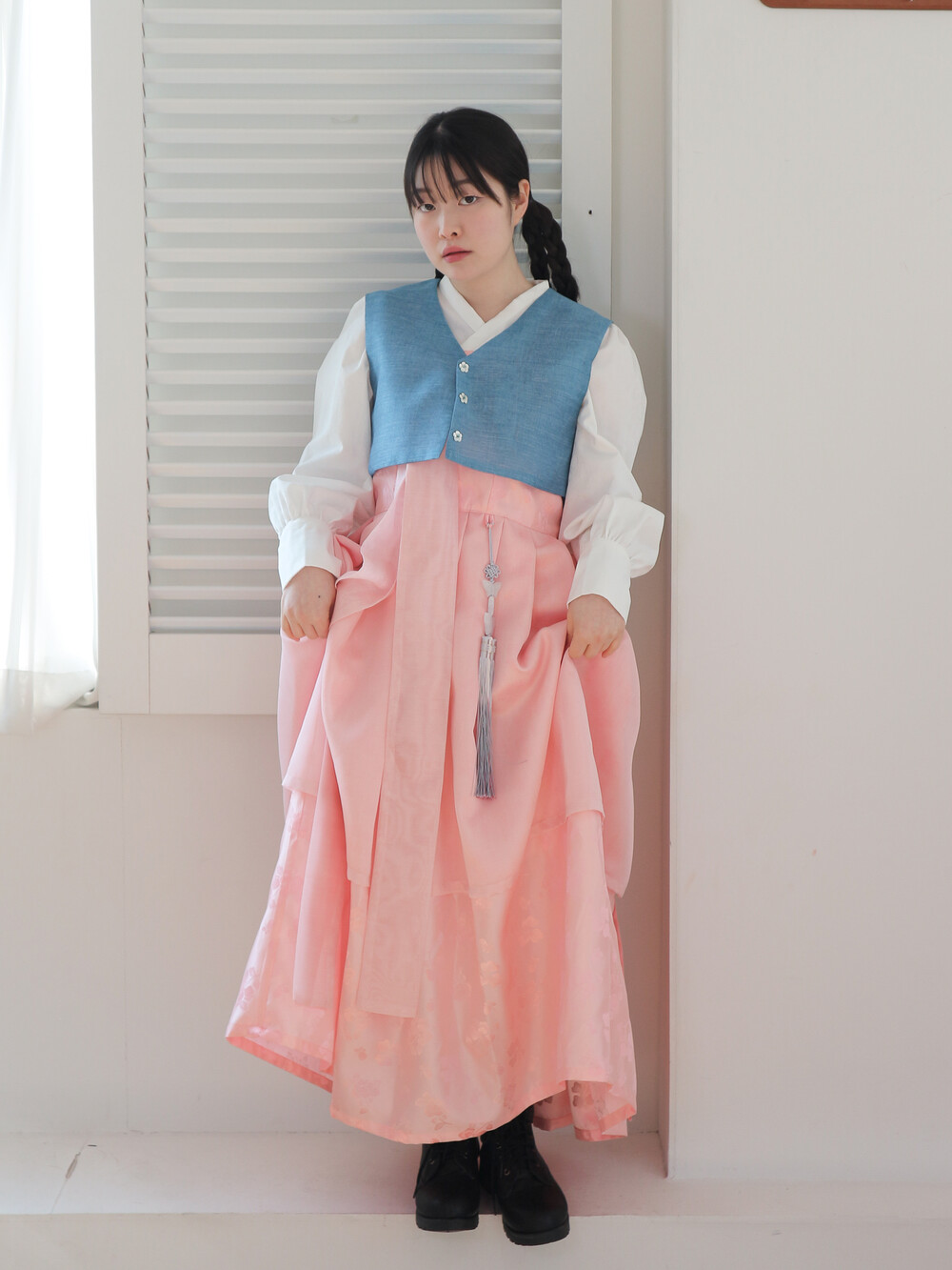 사랑스러운 포인트를 더했습니다.말기 형식으로 끈을 구멍에 넣어 여미는 방식으로 사이즈에 구애받지 않고 입을 수 있는 장점이 있습니다. 양단 원단을 사용해 비침이 적어