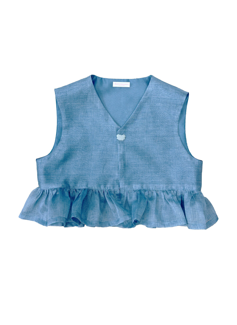 계절에 상관없이 예쁘게 착용할 수 있는 프릴 나비 배자입니다. 겉감과 안감을 모두 한복 견 원단으로 제작하였으며, 크롭 기장으로 제작되어