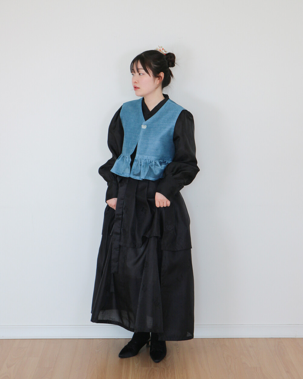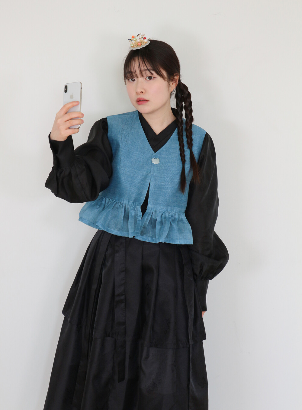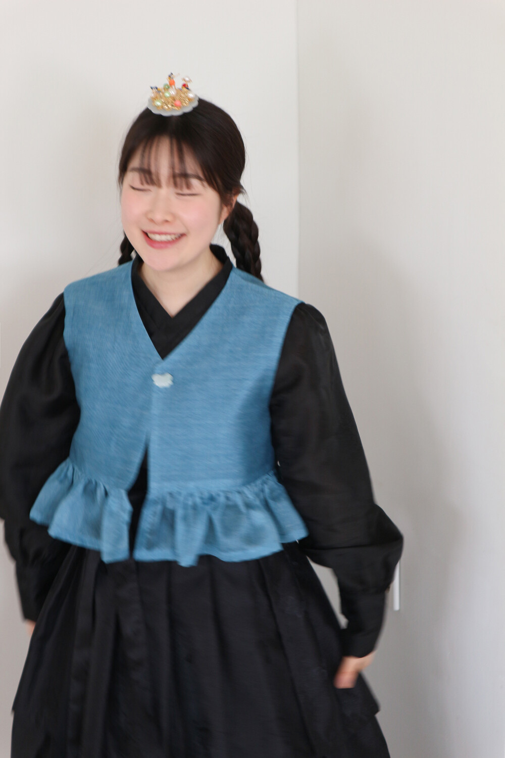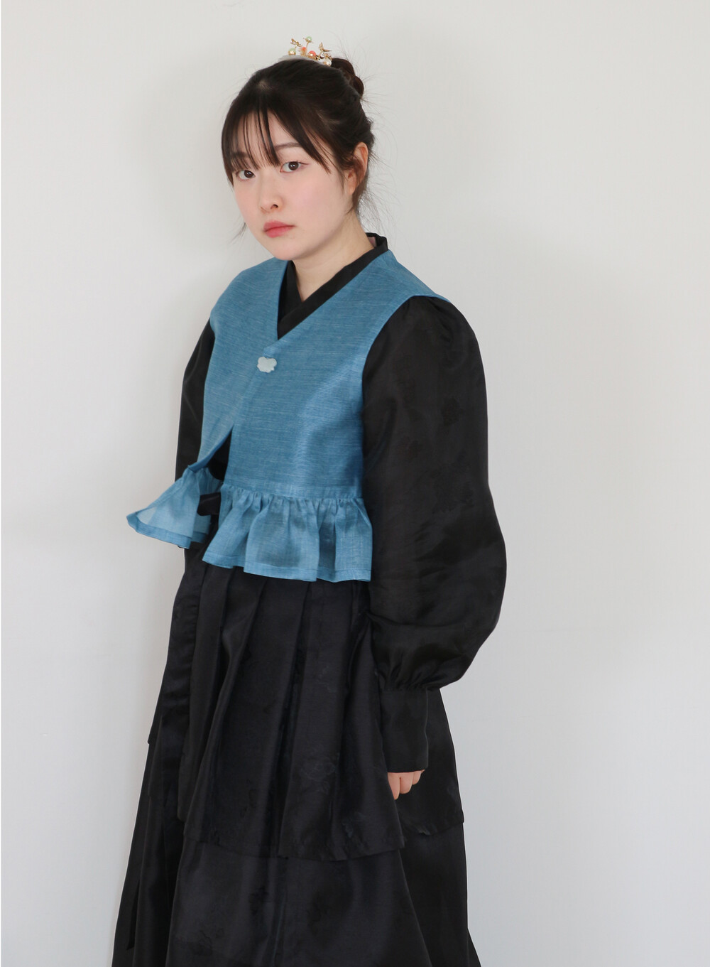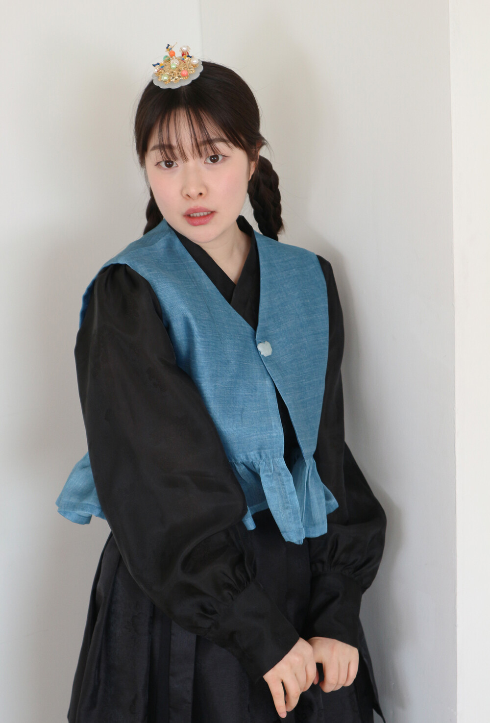 전통한복이나 생활한복등 다양한 룩에 함께 코디하기 좋은 배자입니다.배자 도련선을 따라 셔링 주름을 잡은 단을 더하여 사랑스러운 포인트를 더하였습니다.