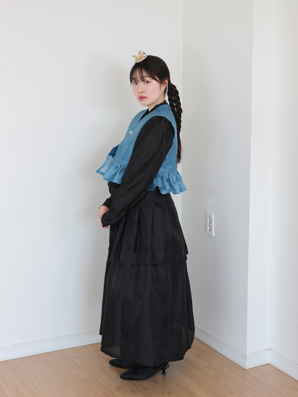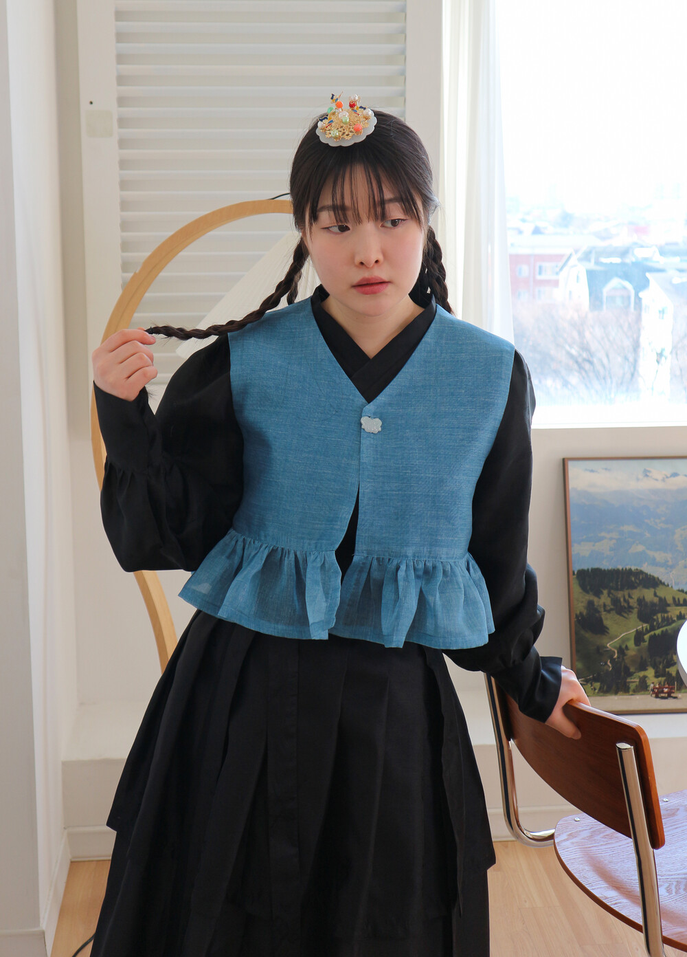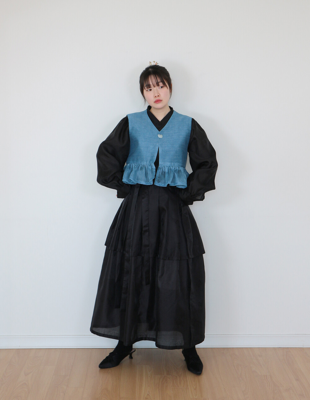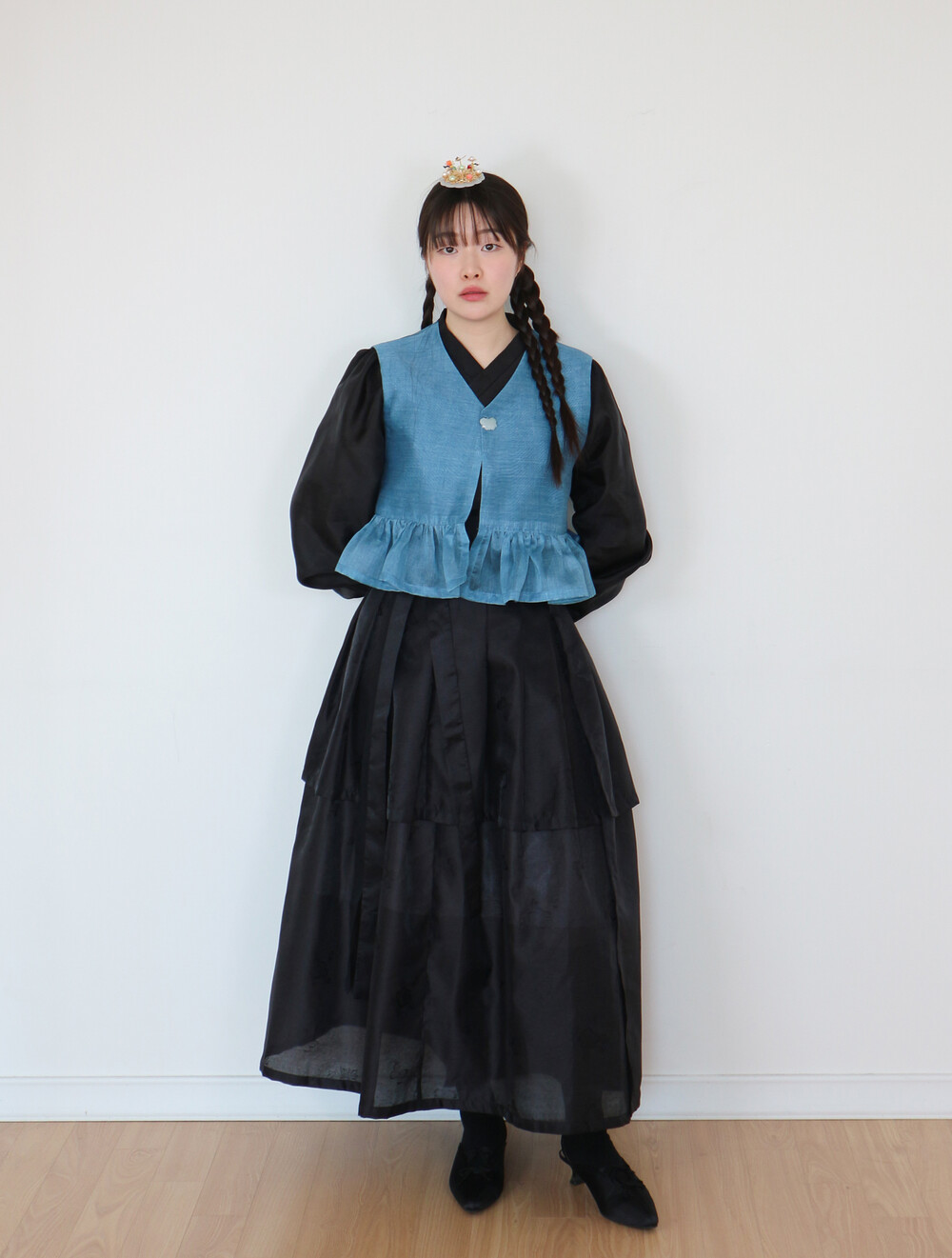 전통한복이나 생활한복등 다양한 룩에 함께 코디하기 좋은 배자입니다.배자 도련선을 따라 셔링 주름을 잡은 단을 더하여 사랑스러운 포인트를 더하였습니다.