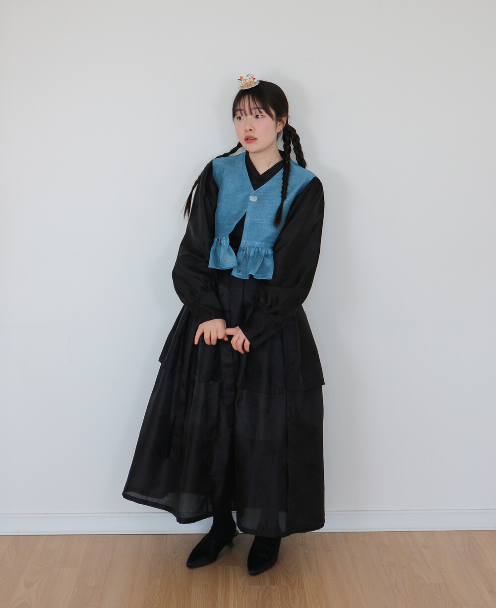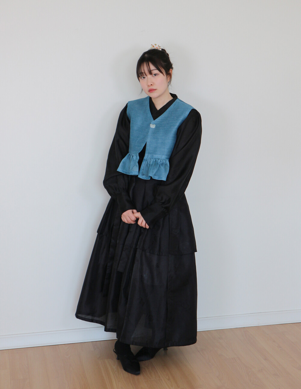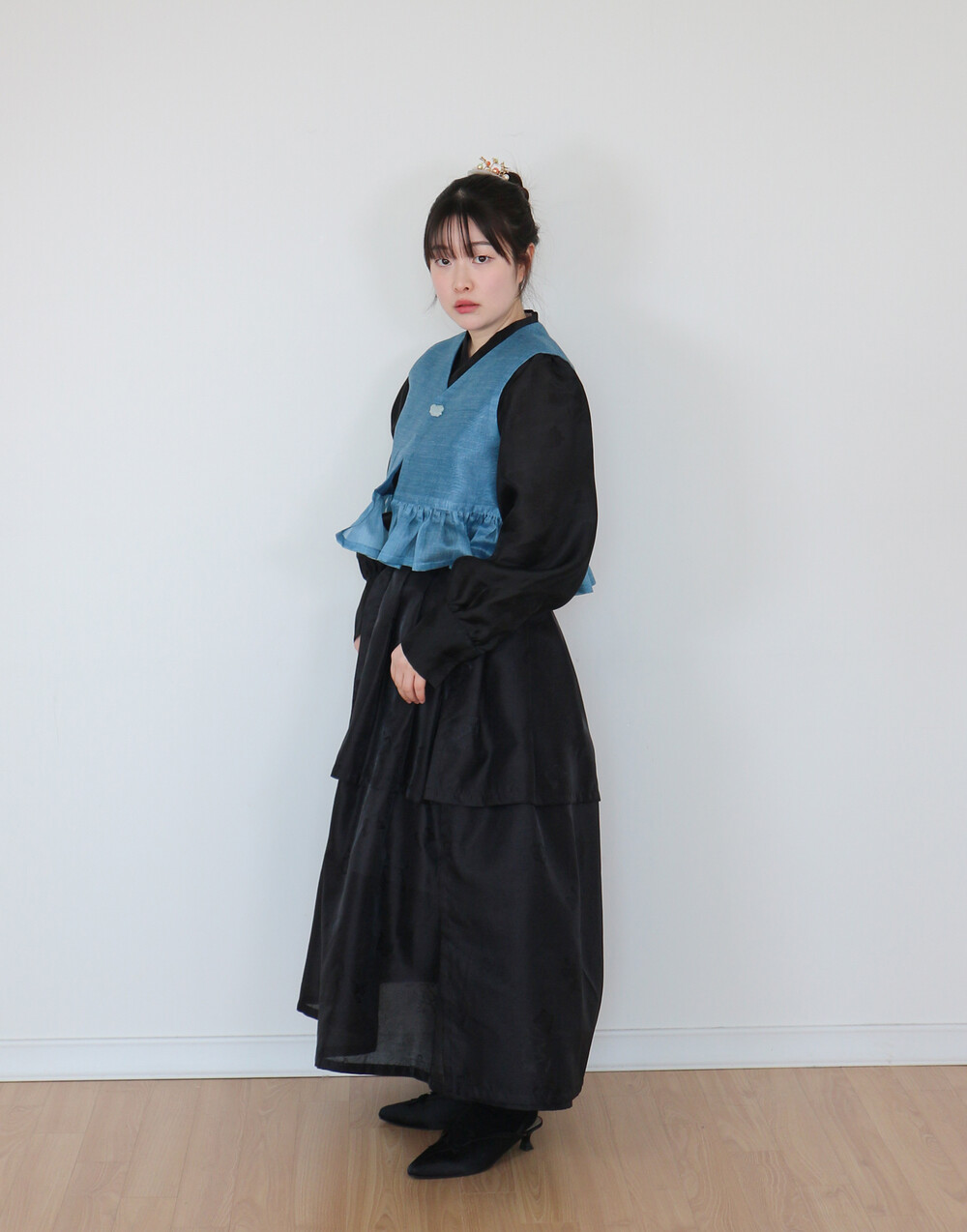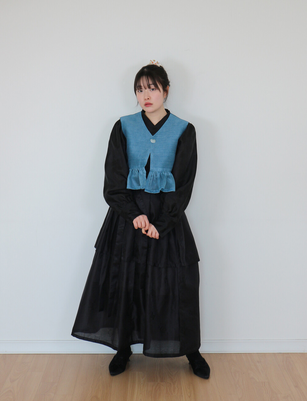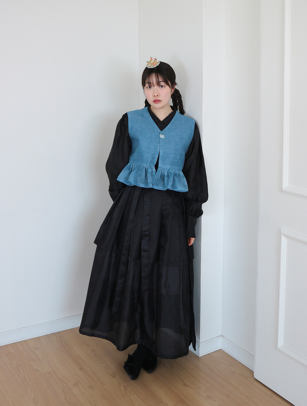 전통한복이나 생활한복등 다양한 룩에 함께 코디하기 좋은 배자입니다.배자 도련선을 따라 셔링 주름을 잡은 단을 더하여 사랑스러운 포인트를 더하였습니다.
