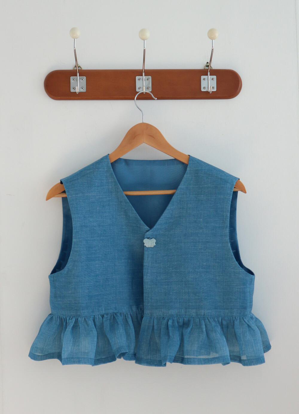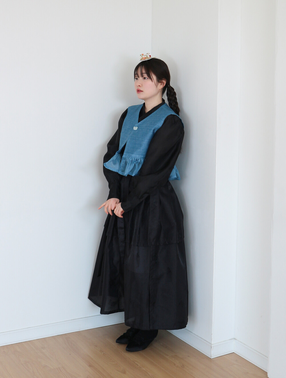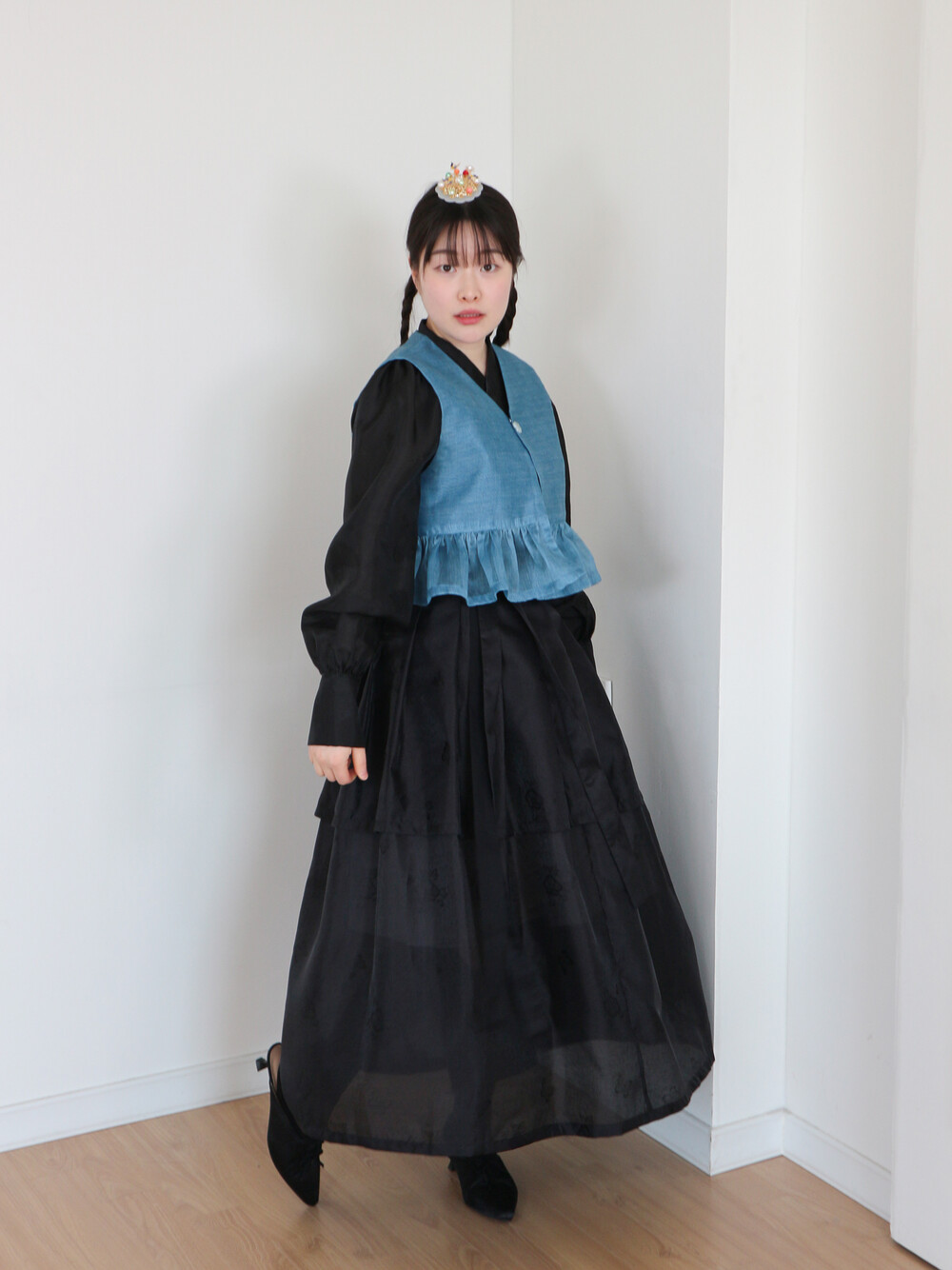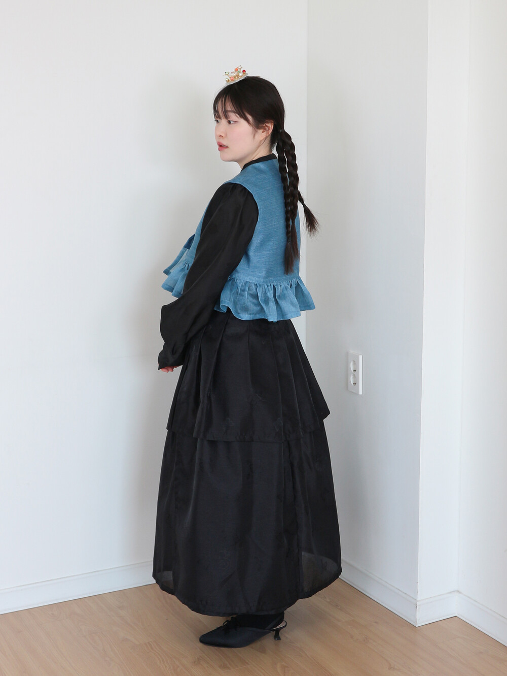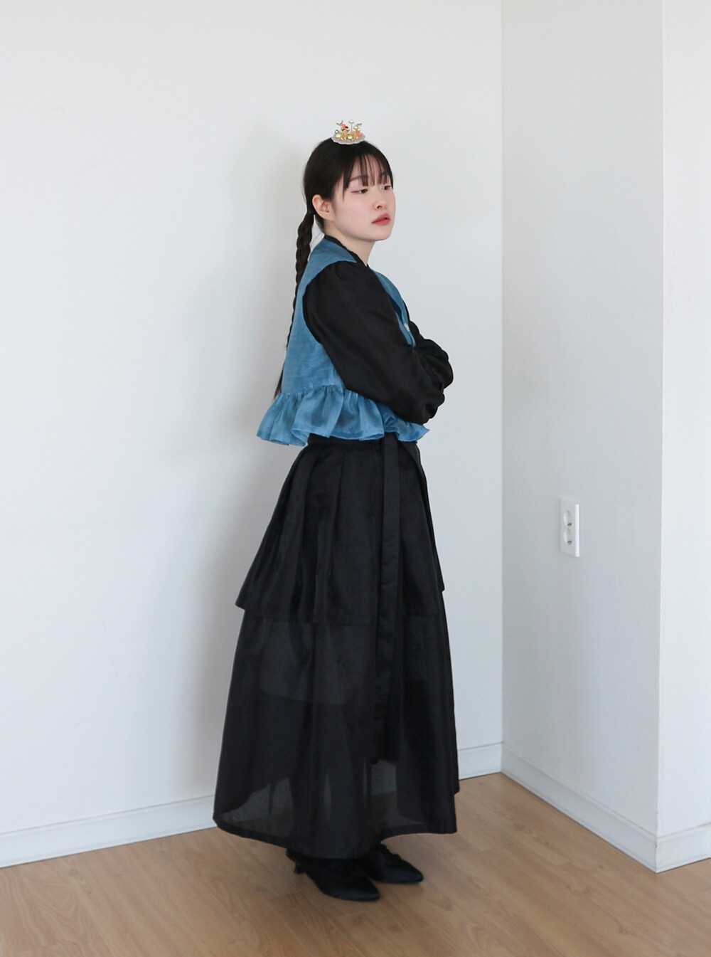 전통한복이나 생활한복등 다양한 룩에 함께 코디하기 좋은 배자입니다.배자 도련선을 따라 셔링 주름을 잡은 단을 더하여 사랑스러운 포인트를 더하였습니다.