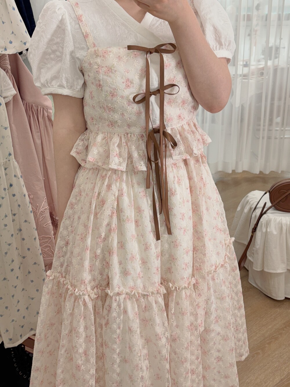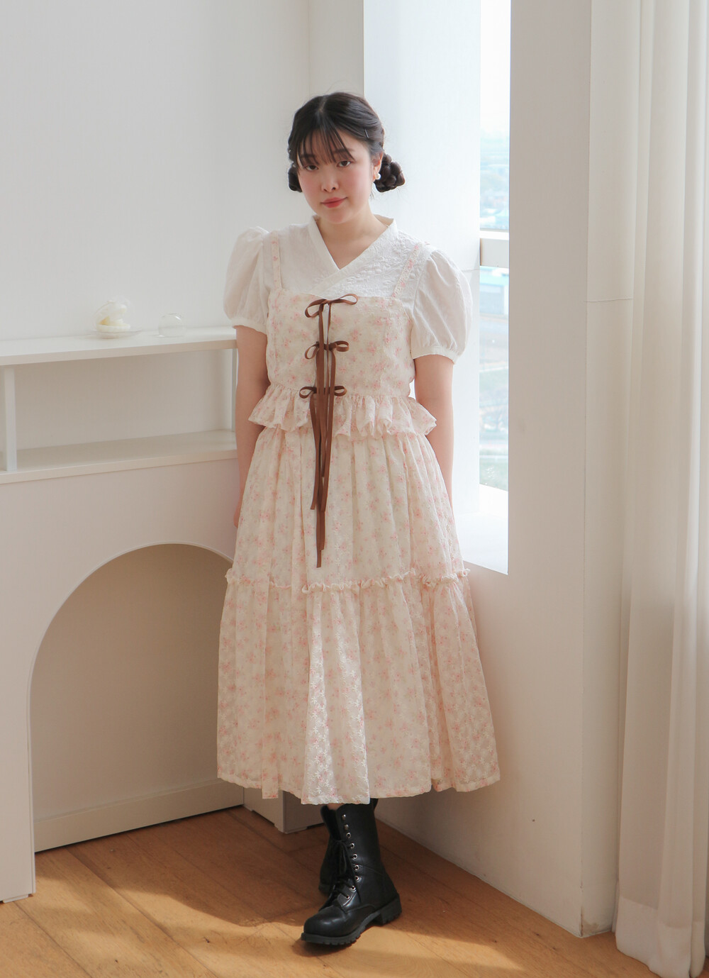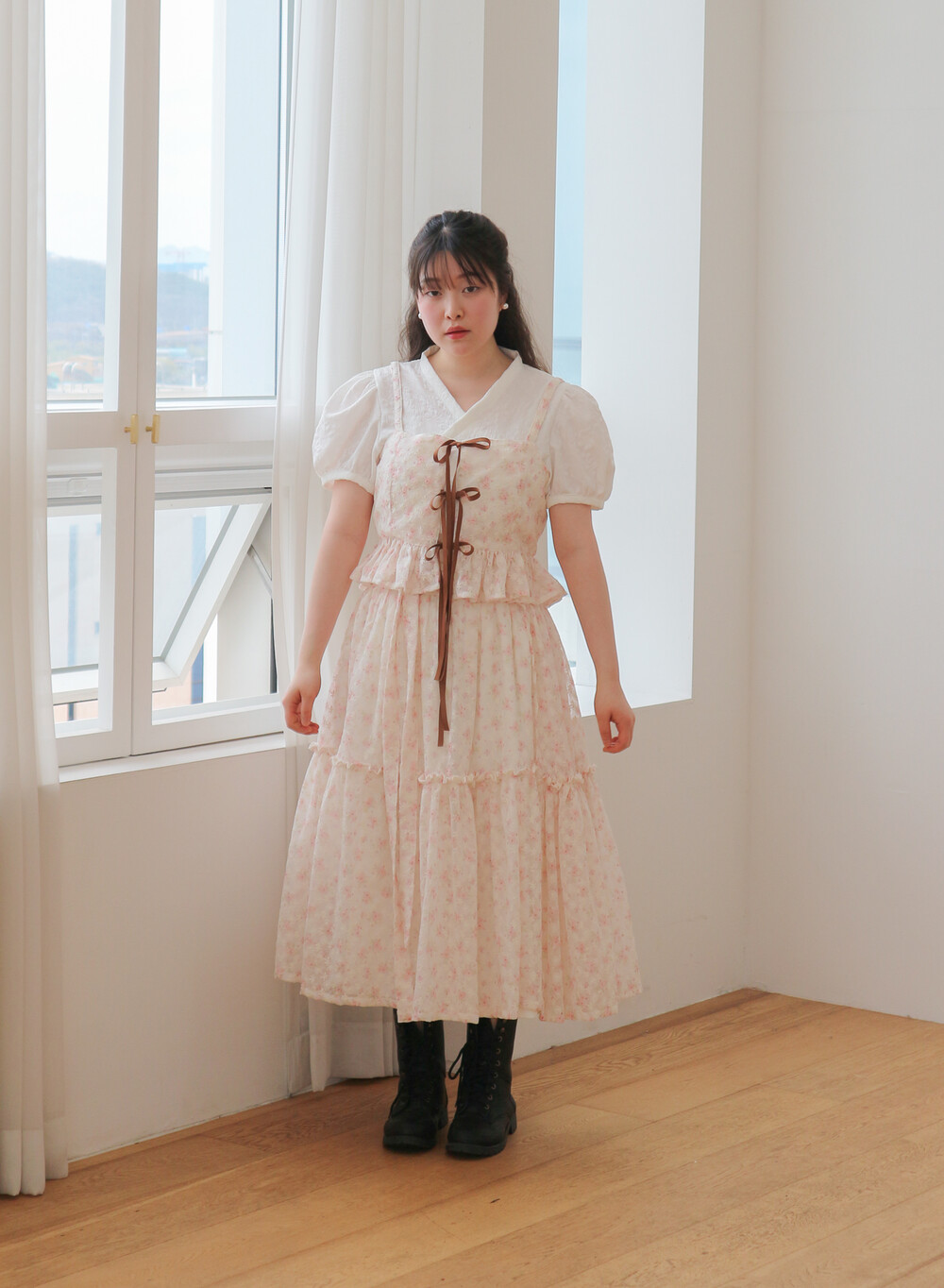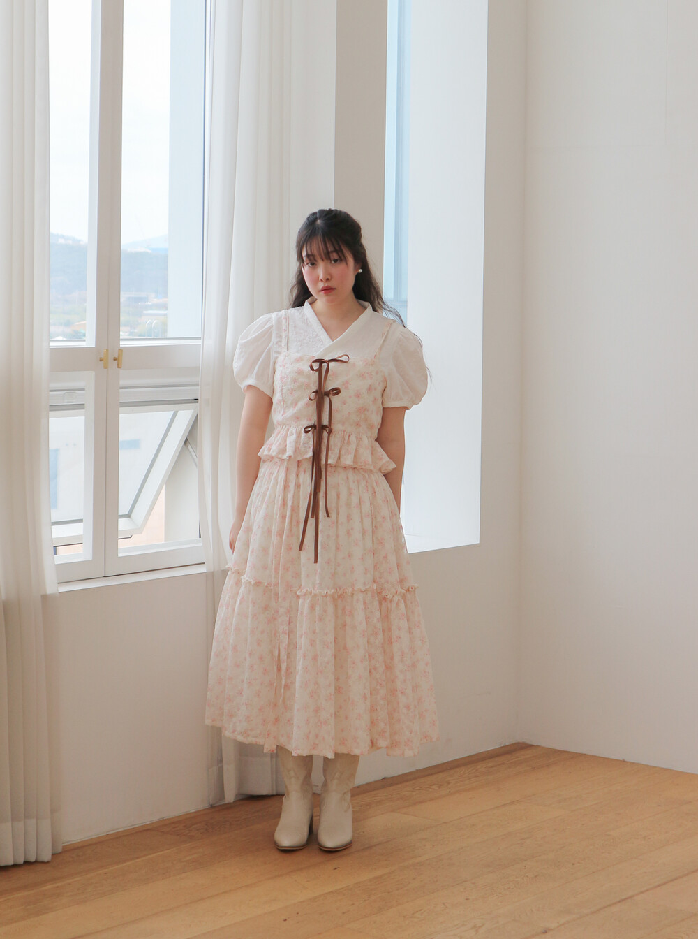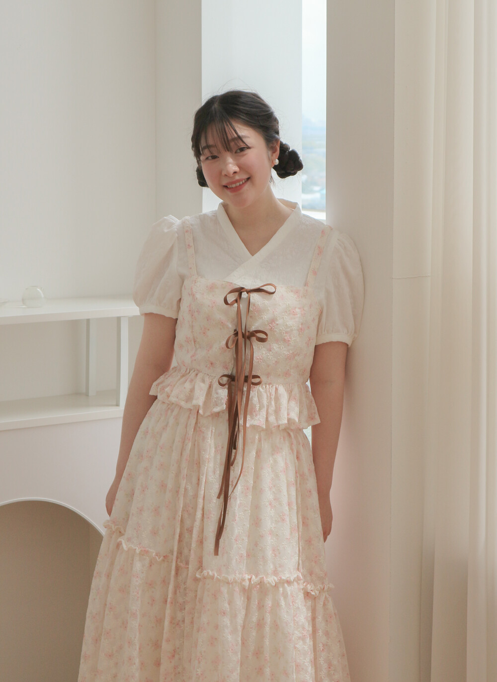 - 여리여리한 쉬폰 원단과 잘 어울리는 사랑스러운 디자인입니다.