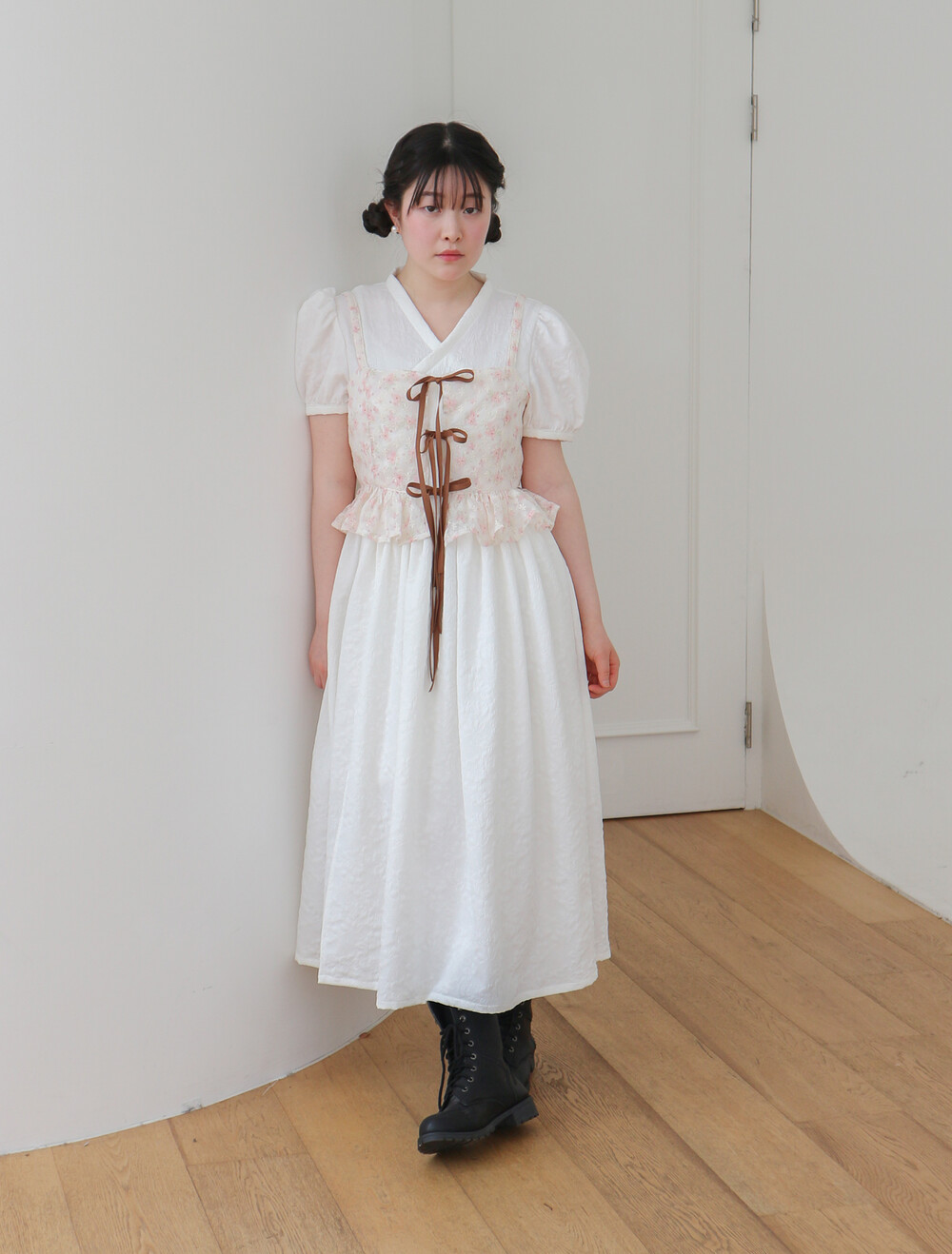 - 프릴 뷔스티에는 앞에서 스웨이드 끈으로 여미도록 제작하였습니다.