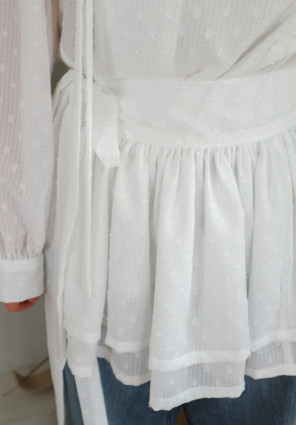 비침이 있는 체크 조직에 입체감있는 도트가 포인트인 원단으로 제작 된