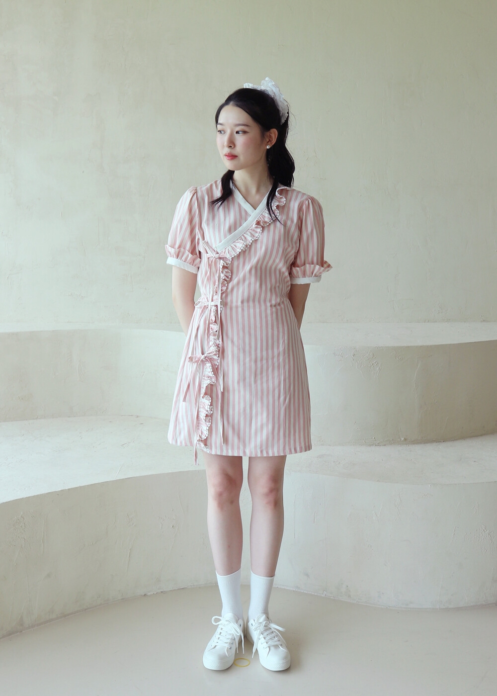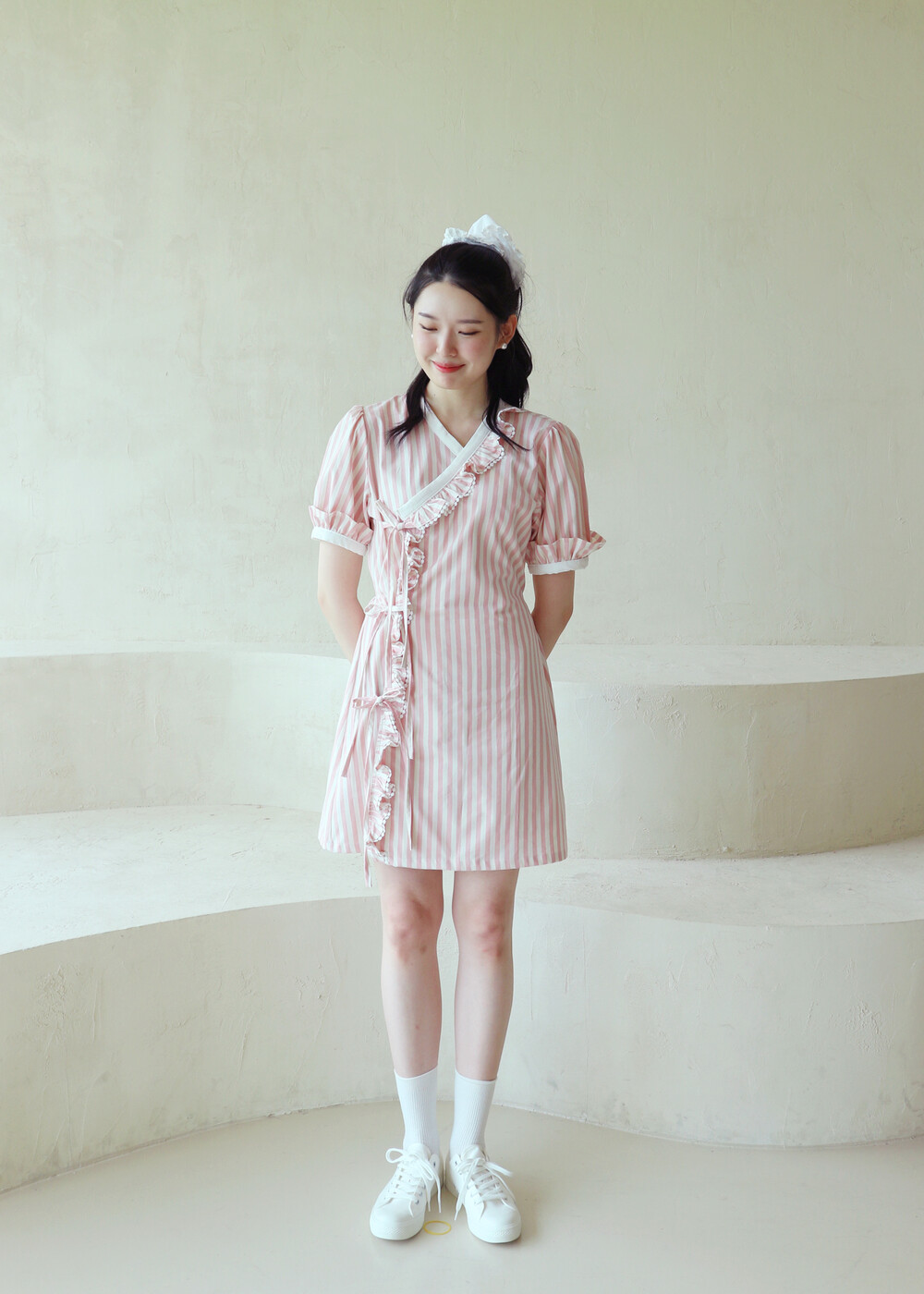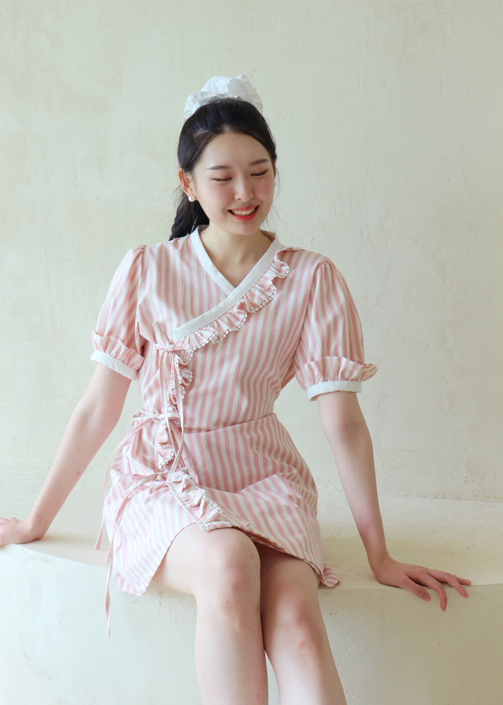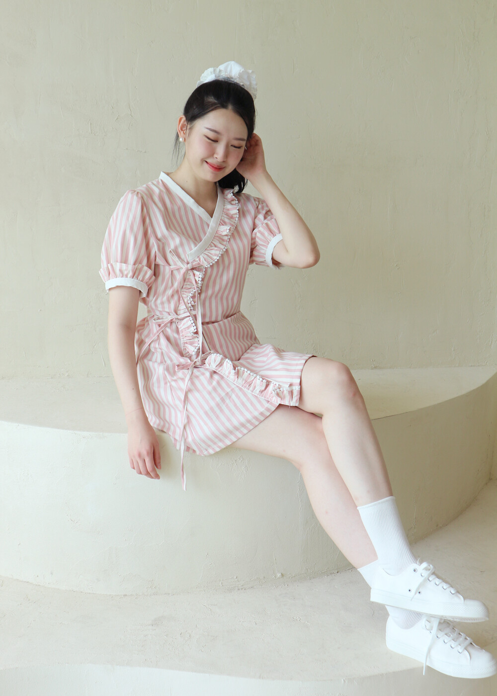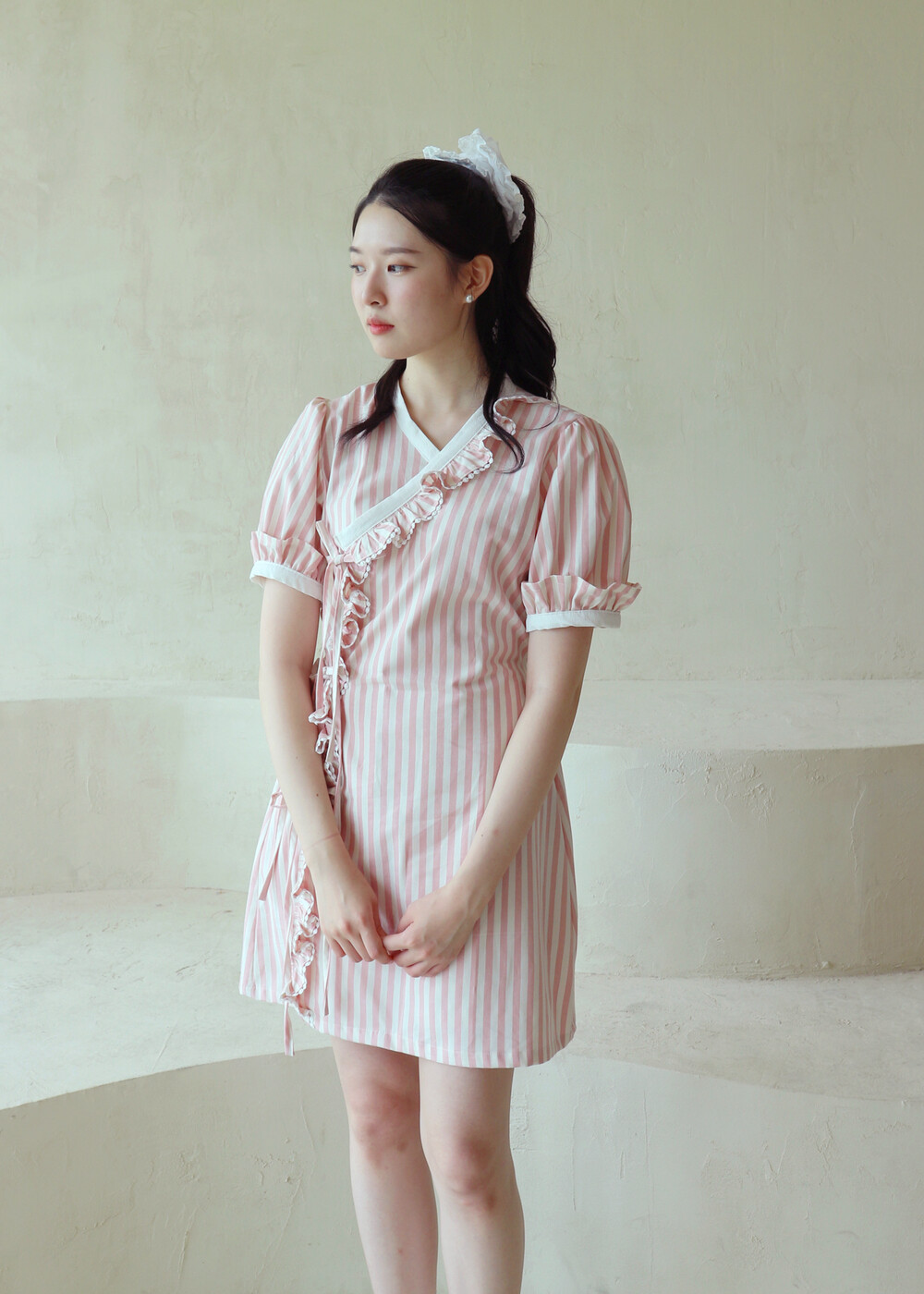 굵은 핑크색 스트라이프 원단의 컵케이크 원피스는