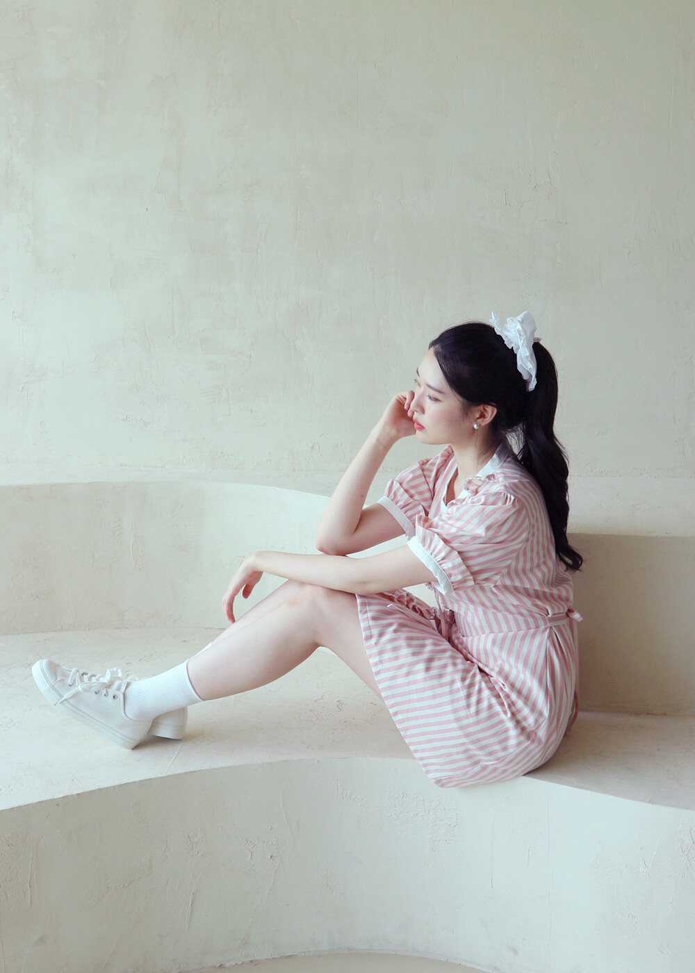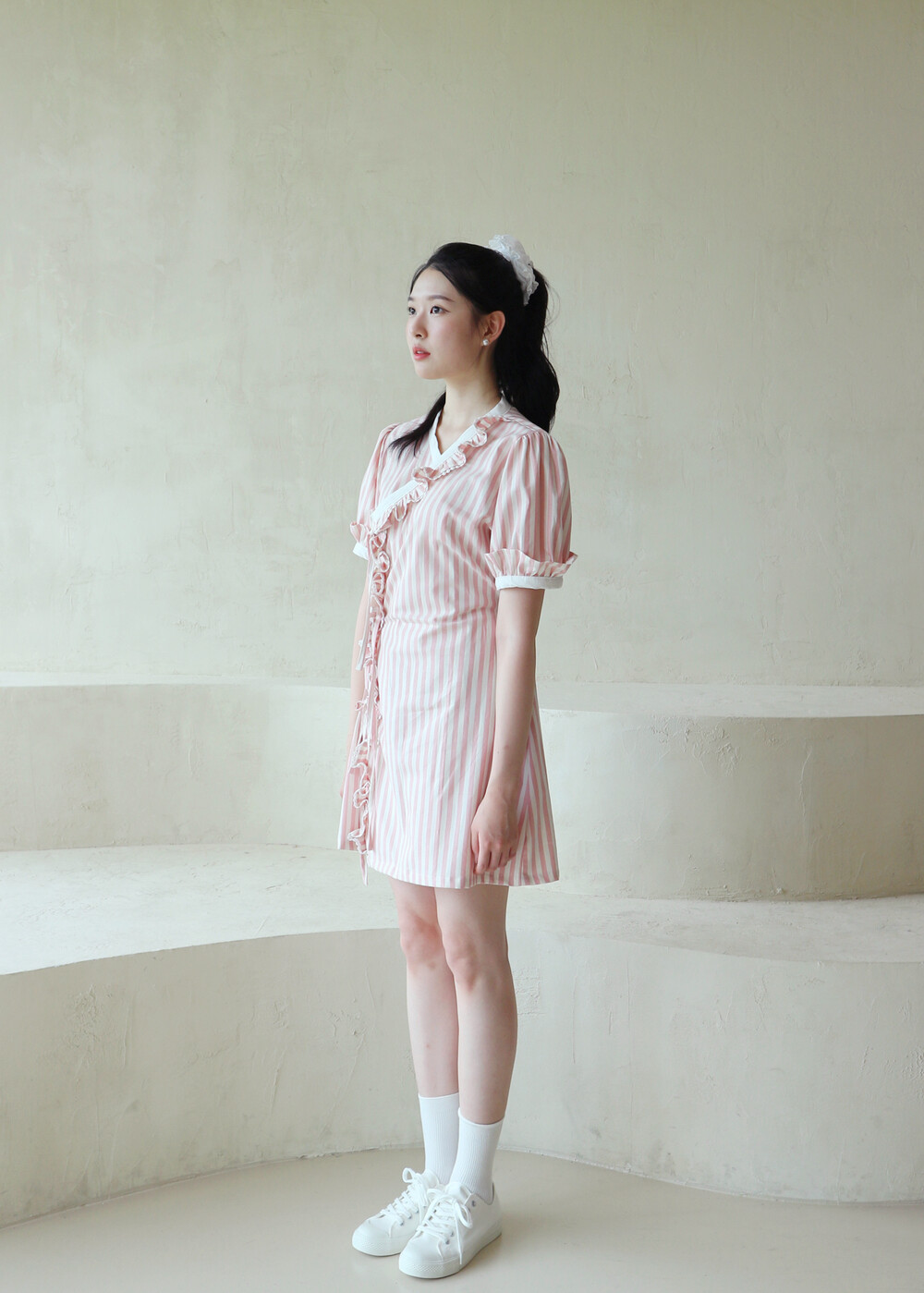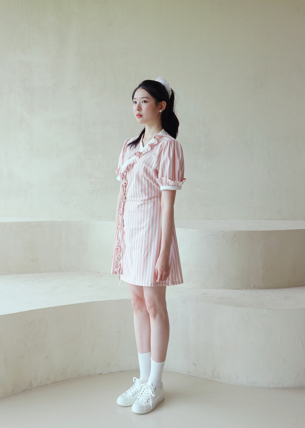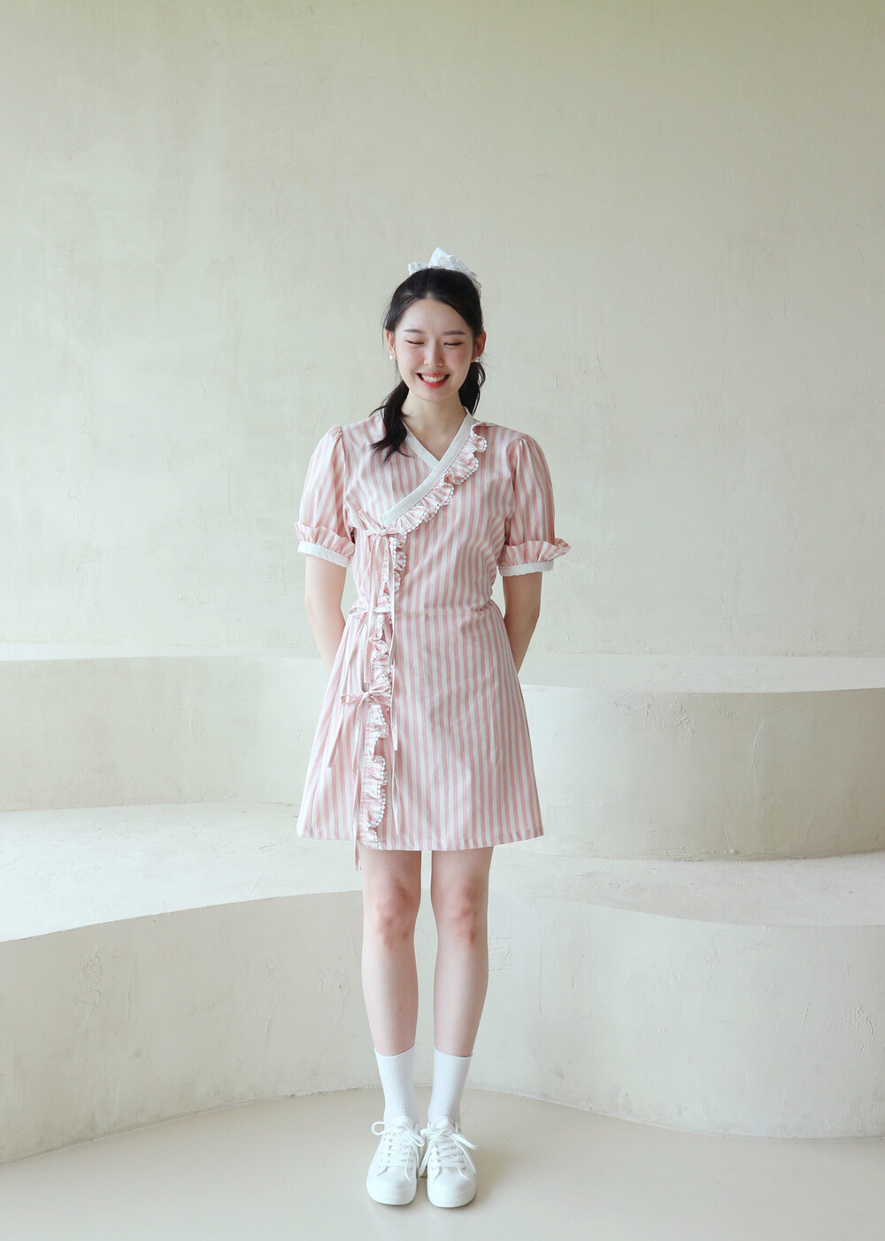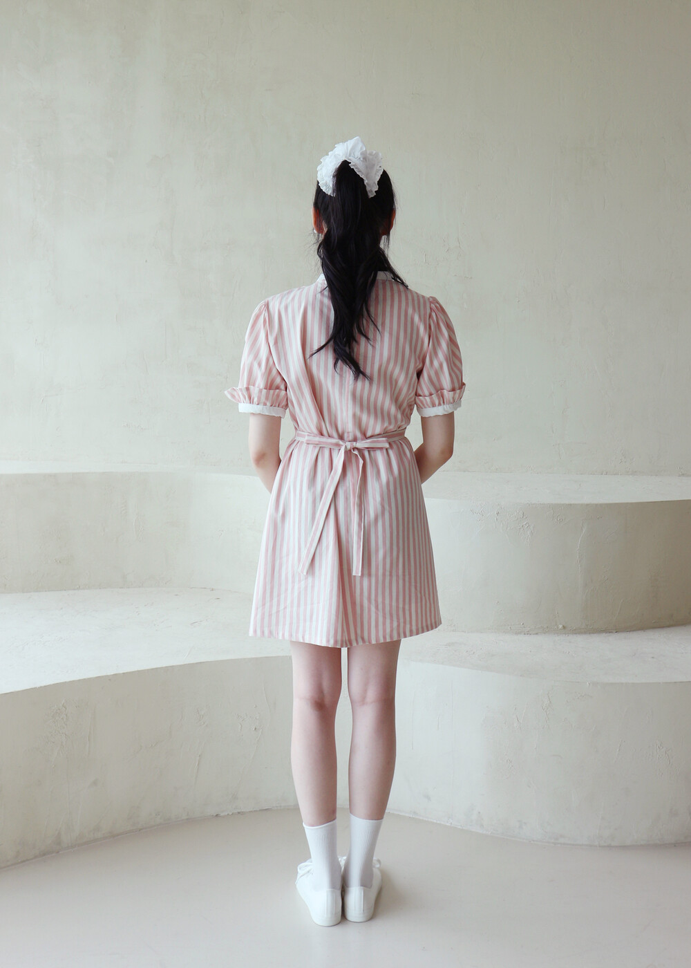 굵은 핑크색 스트라이프 원단의 컵케이크 원피스는